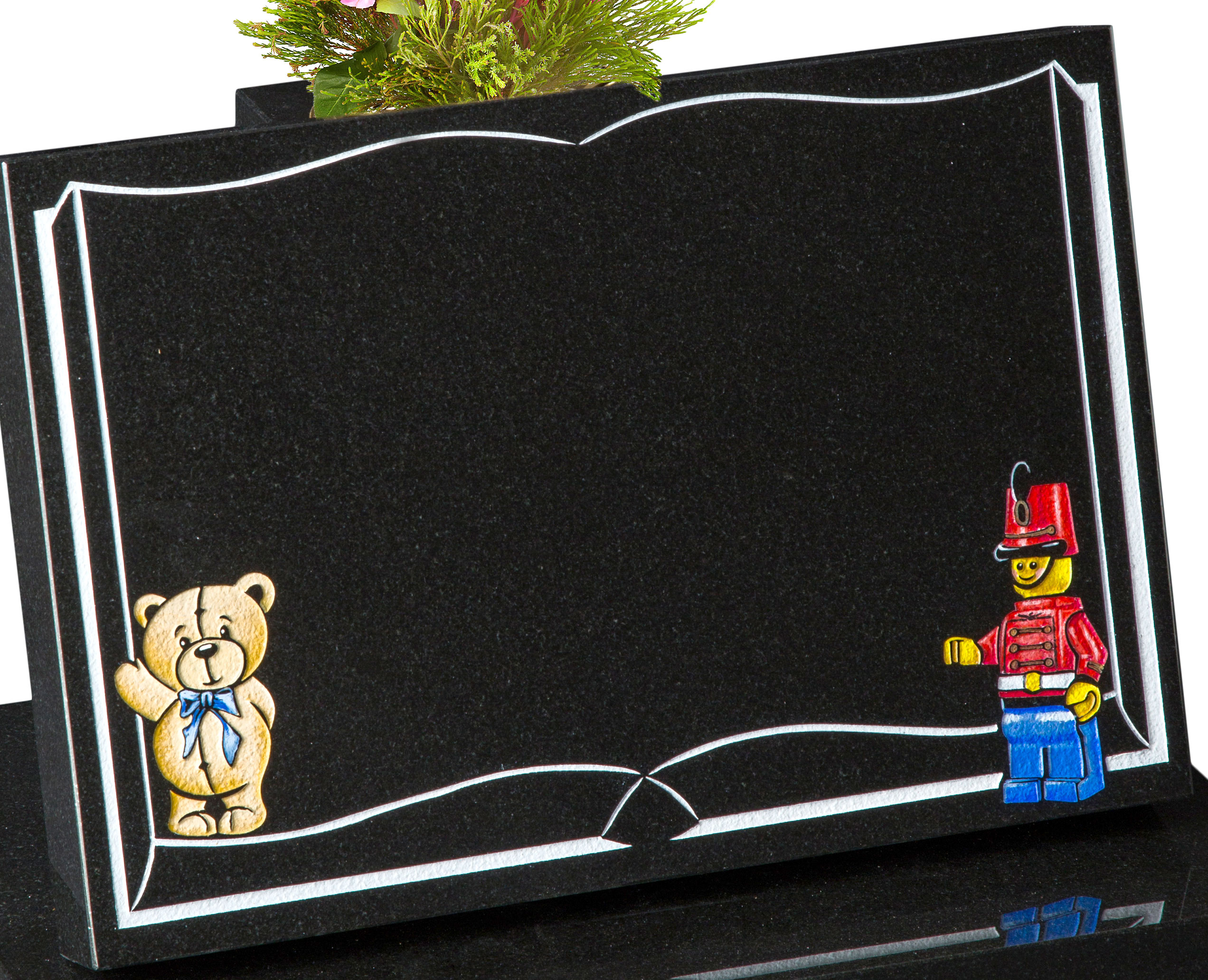 The addition of painted sandblast images to this book and vase create an ever popular children’s memorial. A full range of images are available