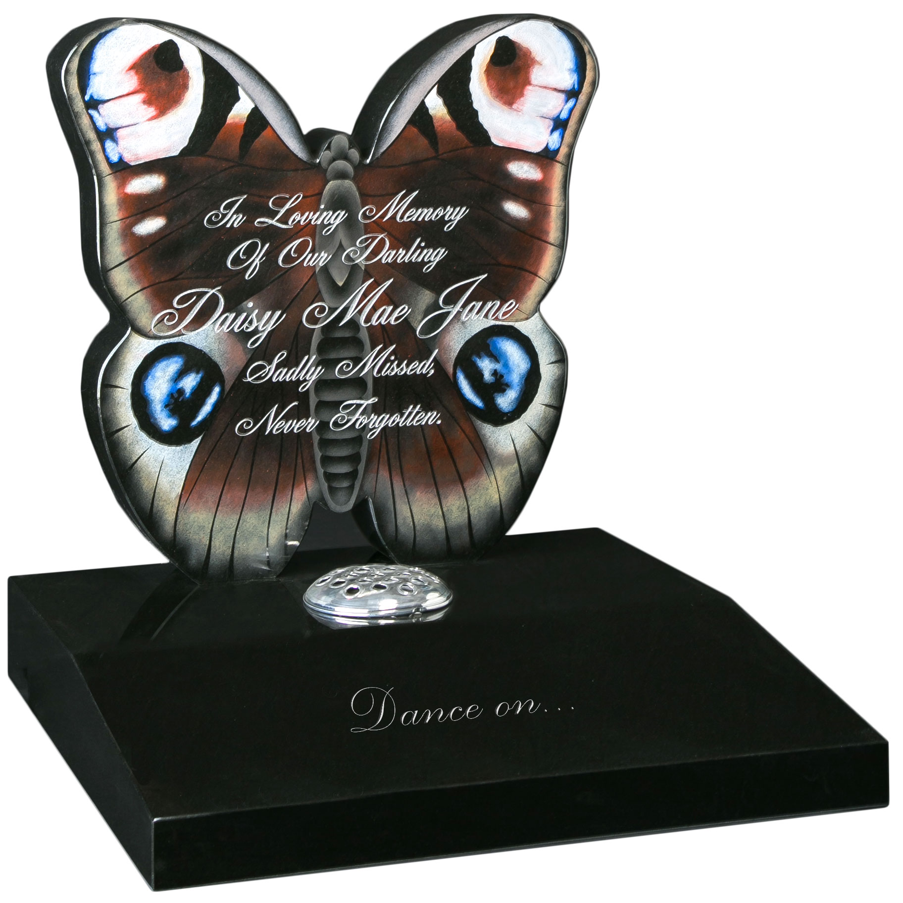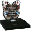 This headstone can be enhanced with an etched and painted design to capture the iridescence of the butterfly’s wings or left as a simple silhouette. The desk tablet base provides additional space for inscription