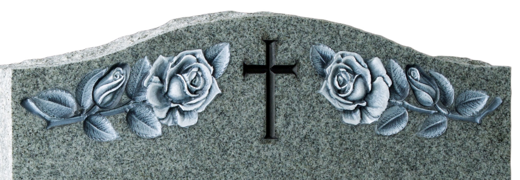 An Ogee shaped headstone with carved cross and roses. Pitched edges to the sides and base