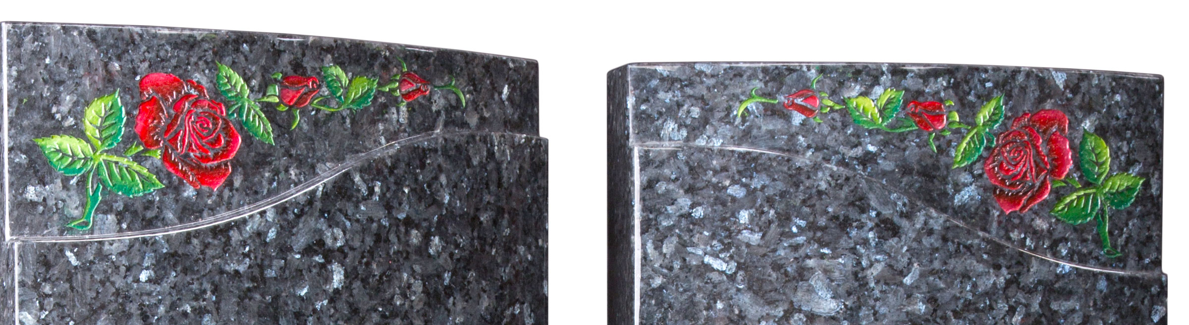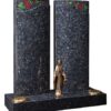 The twin columns of the double headstone have an Ogee shaped recess above which is a painted sandblast design. A bronze ornament is optional