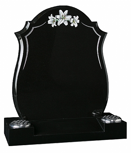A contemporary headstone featuring a tapered pin line design with a hand painted trio of Lilies. The centre splayed base is bored for two vases